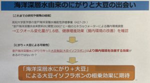 室戸海洋深層水由来飲料水による腸内環境調査で、腸内環境の改善を確認できました。これにより、室戸海洋深層水にがりで作った大豆食品は、大豆イソフラボンとの相乗効果で腸内環境をより改善する効果が期待できます!